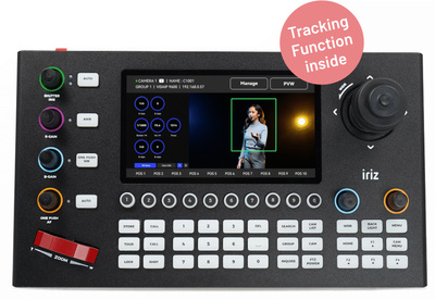iriz PTC-TN, iPTZ Camera Controller, With live image display and automatic tracking, Versatile control via IP, RS-422, RS-485 and RS-232, Integrated 5.5-inch colour screen for direct camera monitoring, Automatic tracking of people – the PTZ camera itself does not require this feature, Tracking is performed by AI software in the controller, Various modes are possible, such as: head / head and shoulders / whole person, as well as person on the left / right / centre of the image – ideal for presentations, e.g. in front of a blackboard., Compatible with common protocols: NDI, VISCA, VISCA-over-IP, Sony VISCA, ONVIF, Pelco P/D, Control of up to 255 cameras via IP, 7 cameras via VISCA directly, Professional 4D joystick for precise pan, tilt and zoom control, Individually adjustable camera movements (cruise function) with memory and quick recall options, TALLY light output (GPIO) to indicate the active camera, Multi-colour LED key display for quick function assignment, Screenshot function with storable image recordings for later analysis, Customisable boot interface for tailor-made application scenarios, Quick IP camera search and automatic protocol configuration@+*Technical specifications:*, Interfaces & protocols: IP (RJ45), RS-232, RS-485/RS-422, Supported protocols: NDI, ONVIF, VISCA-over-IP, VISCA, Pelco-D, Pelco-P, Serial baud rates: 2400 / 4800 / 9600 / 19200 / 38400 bps@+*Display and controls:*, Display: 5-inch colour LCD, Control: 4D joystick for pan, tilt and zoom, Camera shortcut keys: 10 keys, Camera addresses: Control of up to 255 channels, Presets: up to 255 storable presets@+*Power supply:*, Power over Ethernet (PoE) & DC 12V, Power consumption: 5 W (PoE or DC), Dimensions: 283 x 170 x 111 mm, Weight: 0.97 kg@+*Delivery contents:*, Power supply unit suitable for EU sockets, 150 cm cable length, Screwable power connector